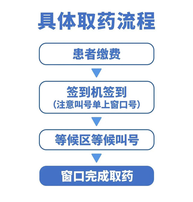 具体取药流程 患者缴费 签到机签到 (注意叫号单上窗口号) 等候区等候叫号 窗口完成取药。取药前,请先前往门诊西药房窗口旁的取号签到机处,扫描缴费结算单上方的条形码签到取号,并根据显示屏信息以及广播提示,前往取号单上的对应窗口取药。