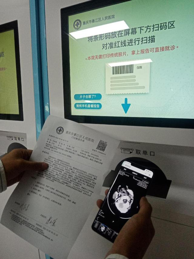 4、胶片和报告怎么领取?用条形码,在自助取片机自己领取,胶片和报告一般都是同一个条形码。