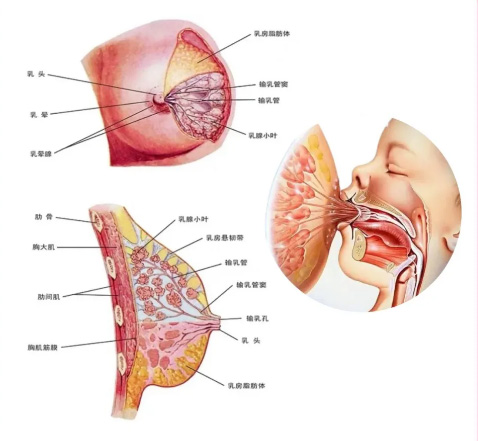 乳腺的正常结构,乳房的大体形态结构,形状是半球状,乳腺上下范围在2-6前肋,左右范围在,内侧胸骨旁线-外侧在腋中线,深面:胸大肌和部分前锯肌,中央部分是乳头、乳晕。正常的乳腺组织是15-20腺叶组成,就像一串大葡萄,每个腺叶又分很多小叶。每一腺叶发出一输乳管,输乳管末端开口于乳头。可以想象成一棵树,树枝就像腺叶。那么乳腺从前向后看,乳腺腺叶与输乳管都以乳头为中心放射状态的排列,那么这个脂肪组织与结缔组织充填于乳腺腺叶和输乳管之间。·乳腺结构由浅入深依次为,皮肤、皮下组织、腺体层、腺体后组织。乳腺的结构是皮肤,皮下脂肪,腺体层。