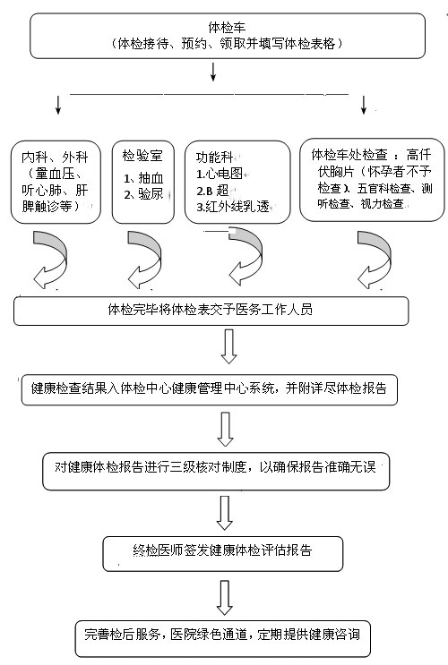 6:在体检车上体检完后,体检单不可由体检者带走,统一收回,带回中心,交予前台,前台回收体检单,表示,此人体检结束!并提交到录入室!