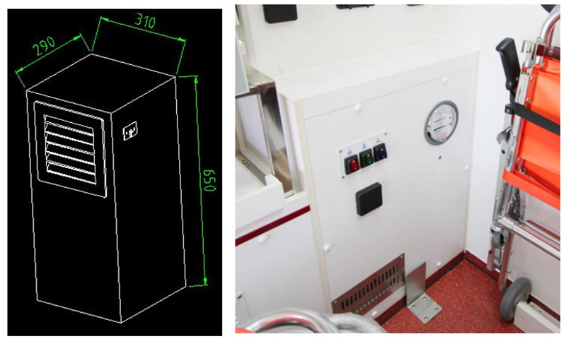 救护车厂家使用医疗舱安装车载负压净化装置负压系统,具体为:在特定的装置下,救护车的驾驶室与后舱、后舱与外界严格密封,应用受控的科学通风量系统,既可以保证救护车后舱内的流入新鲜空气,又能严格控制后舱的负压度。救护车厂家可以在后舱内的气压低于救护车舱外的气压,从而保证只能是外界的新鲜空气可以流入救护车后舱,后舱内被患者或疑似患者污染过的空气或污染的气溶胶就不会随意四处泄露出去。后舱内的含污染气溶胶的空气由特殊设计的定向排风系统,经专门的通道再由高效空气过滤器过滤后安全地排放到外界,救护车外的空气就不会被污染,从而减少了对环境的污染几率。在救护舱内的空气流动遵循“由上而下、由前而后”的原则,舱内的空气被强制形成强烈的定向流。因此也充分保护了救护及陪护人员的人身安全。这种负压隔离救护车最适合运送通过空气传染的呼吸道传染性疾病的病人或有待确诊的疑似病人。救护车厂家利用负压原理,采用可靠的物理措施,隔离病原微生物,同时将室内被患者污染的空气(气溶胶)经高效空气过滤器过滤后安全排放,不会污染环境。救护车厂家通过通风换气及合理的气流形式,不断地稀释救护车后舱内空气中的病原微生物浓度,由于后舱与驾驶室严格密封,因此使驾驶人员等处于严格分离保护状态,在后舱的医护人员采取卫生部办公厅关于印发《甲型H1N1流感病例转运工作方案》的通知的要求就能保护了医护人员的工作安全。救护车厂家传染病负压隔离救护车上的空气过滤器是由进口硅硼酸盐纤维过滤膜制作而成(粒径≥0.3μm;过滤效率达99.99%),所有过滤器均经过严格的PAO扫描检测。配以德国进口耐高冲击(冲击强度≥3G)高性能风机,连续运行寿命在50000小时以上。机组具有高静压、大风量的特性,可以满足6~10m3的密闭空间形成-10~-30Pa的负压;车载负压净化装置还内置UV紫外灯灭菌系统,在每次转运结束,可对内置的高效空气过滤器进行消毒灭菌。有效防止交叉污染;