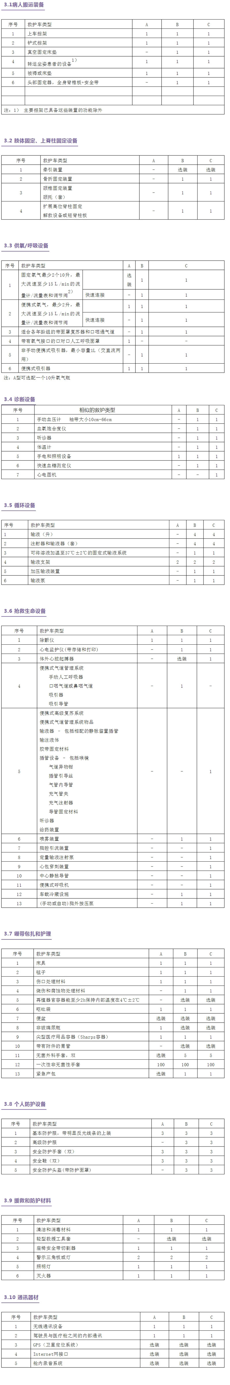 设备装备时也可由使用单位按本标准购置,表1~表10规定不同救护车类型所携带最少的设备。