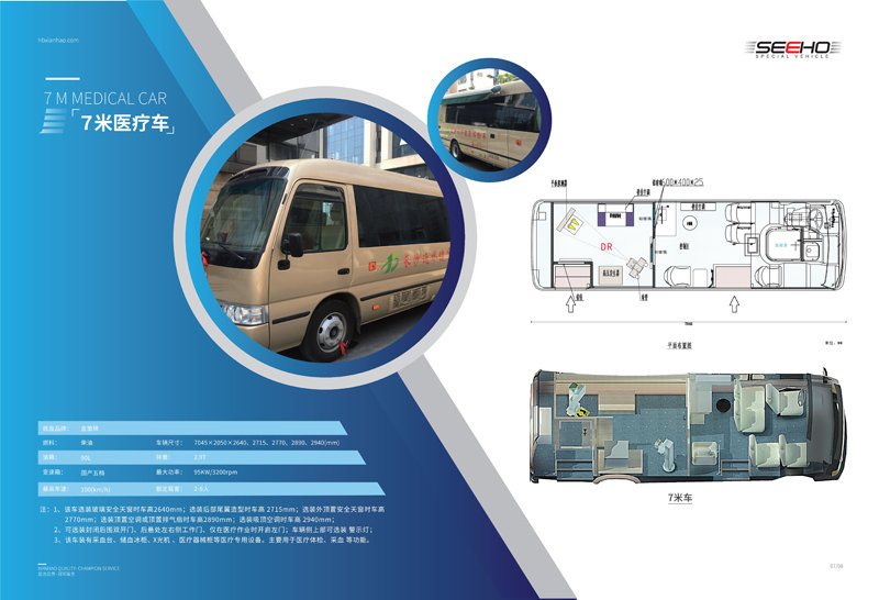 体检车是为医疗行业设计的可以满足常规体检、治疗、应急医疗救援等功能的专用车辆,车内配备专业车载X射线机、心电超声检查、电测听室、全自动生化分析仪以及检查床、冰柜、空调和紫外线消毒灯等先进医疗仪器设备。