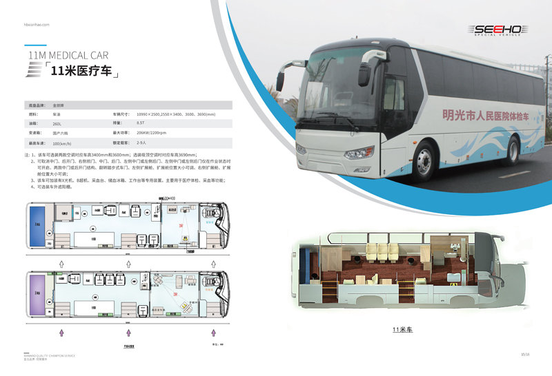 我司生产的职业病体检车均选用一线品牌车(宇通、金龙、金旅); 车长有6米、7米、8.2米、9米、10.5米、11米、12米可选。